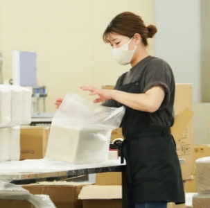 また、商品は直接お客様に配送される為、手に取って頂くお客様をイメージしながら丁寧に梱包しています。贈り物用のラッピング業務などEC物流センターならではのサービス業務も行なっています。